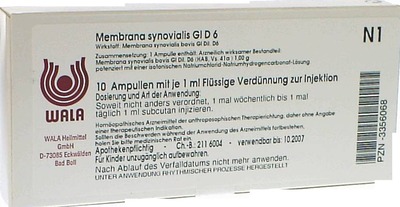 Die Membrana synovialis GL D6 Ampullen enthalten als Wirkstoff: Membrana synovialis suis Dil. D6 aquos. (HAB, V. 43a).