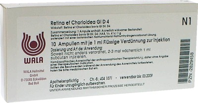 Retina et chorioidea GL D 4 Ampullen sind ein homöopathisches Arzneimittel zur Unterstützung der Funktion von Retina (Netzhaut) und Chorioidea (Aderhaut) im Auge.