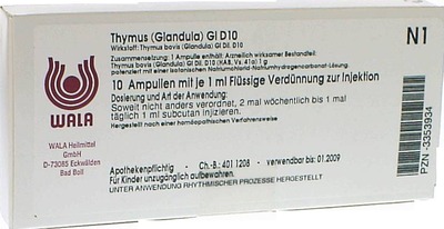 - Thymus (Glandula) Gl D10 Ampullen sind ein homöopathisches Arzneimittel, das traditionell zur Stärkung des Immunsystems und zur Aktivierung der Selbstheilungskräfte eingesetzt wird. Sie enthalten eine potenzierte Form von Thymus-Extrakt.