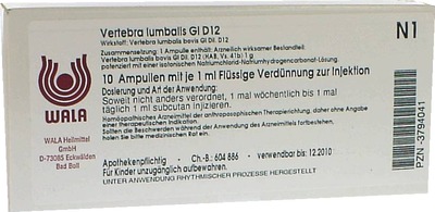 - Vertebra Lumbalis GL D12 Ampullen sind ein homöopathisches Arzneimittel, das auf natürliche Weise die Selbstheilungskräfte des Körpers aktiviert und die Ursachen der Beschwerden angeht. Herkömmliche Schmerzmittel lindern lediglich die Symptome, ohne die Ursache zu behandeln.
